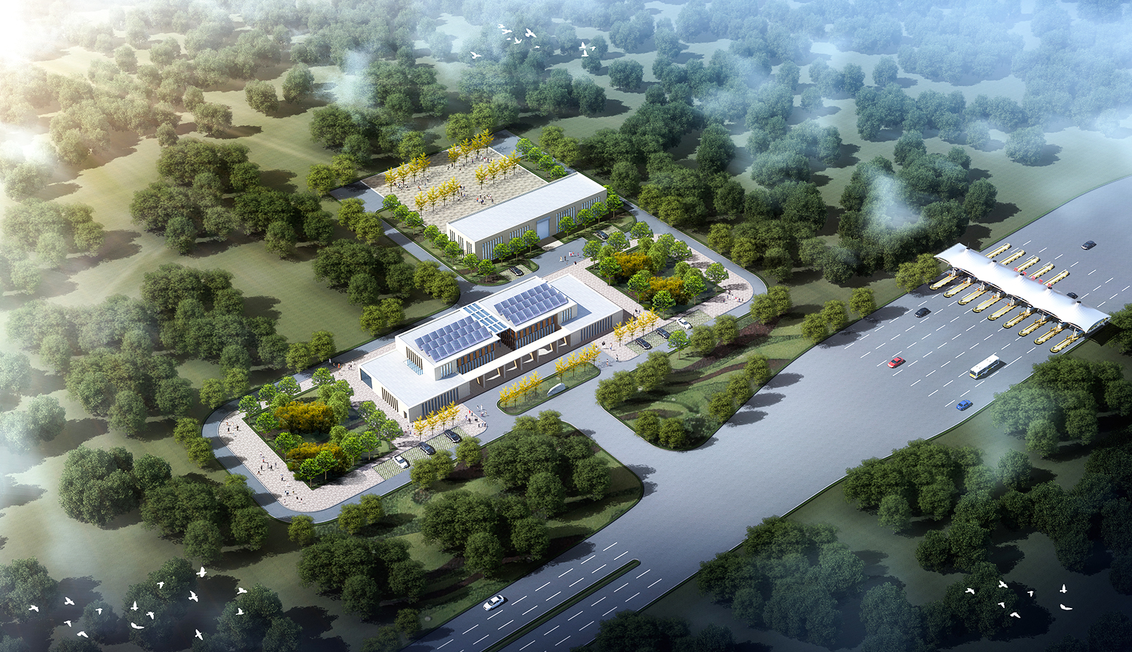 新機(jī)場高速公路是膠東國際機(jī)場集疏運(yùn)系統(tǒng)的重要組成部分,是連接我市主城區(qū)的迎賓大道。主線收費(fèi)廣場作為青島的門戶,旅客來青的第一印象,方案設(shè)計(jì)充分體現(xiàn)青島城市特征,建筑形式與新機(jī)場航站樓“海星”造型相互呼應(yīng),從“建筑風(fēng)格、視覺傳達(dá)、空間感受”三個(gè)方面完善方案設(shè)計(jì),遵從生態(tài)環(huán)保原則,實(shí)現(xiàn)收費(fèi)雨蓬、站房、生態(tài)環(huán)境協(xié)調(diào)統(tǒng)一,結(jié)合地域特色與地產(chǎn)描畫,展現(xiàn)城市海洋文化。