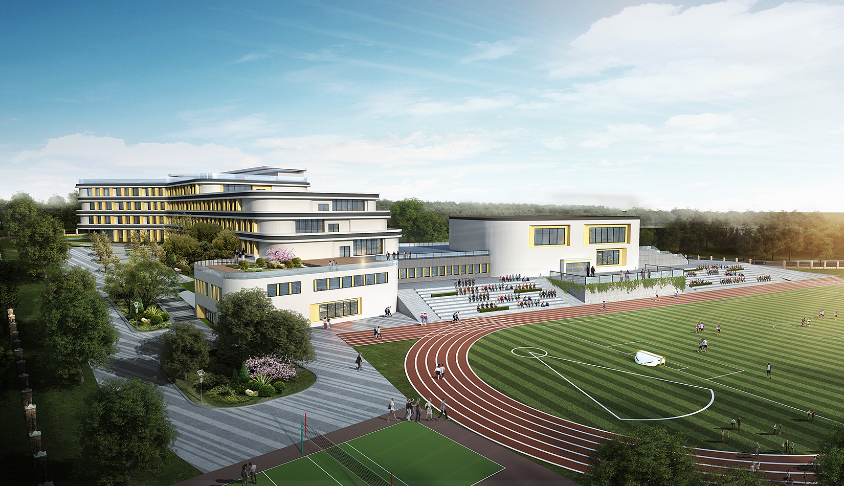 該項目設(shè)計打破傳統(tǒng)的班級串聯(lián)式學(xué)校模式,植入聯(lián)系各個功能區(qū)的中庭大空間,使用者一旦進入,即可到達任一功能區(qū);同時該中庭大空間又是學(xué)生之間、師生之間、及學(xué)生家長們的公共自由開放式交流會面空間。