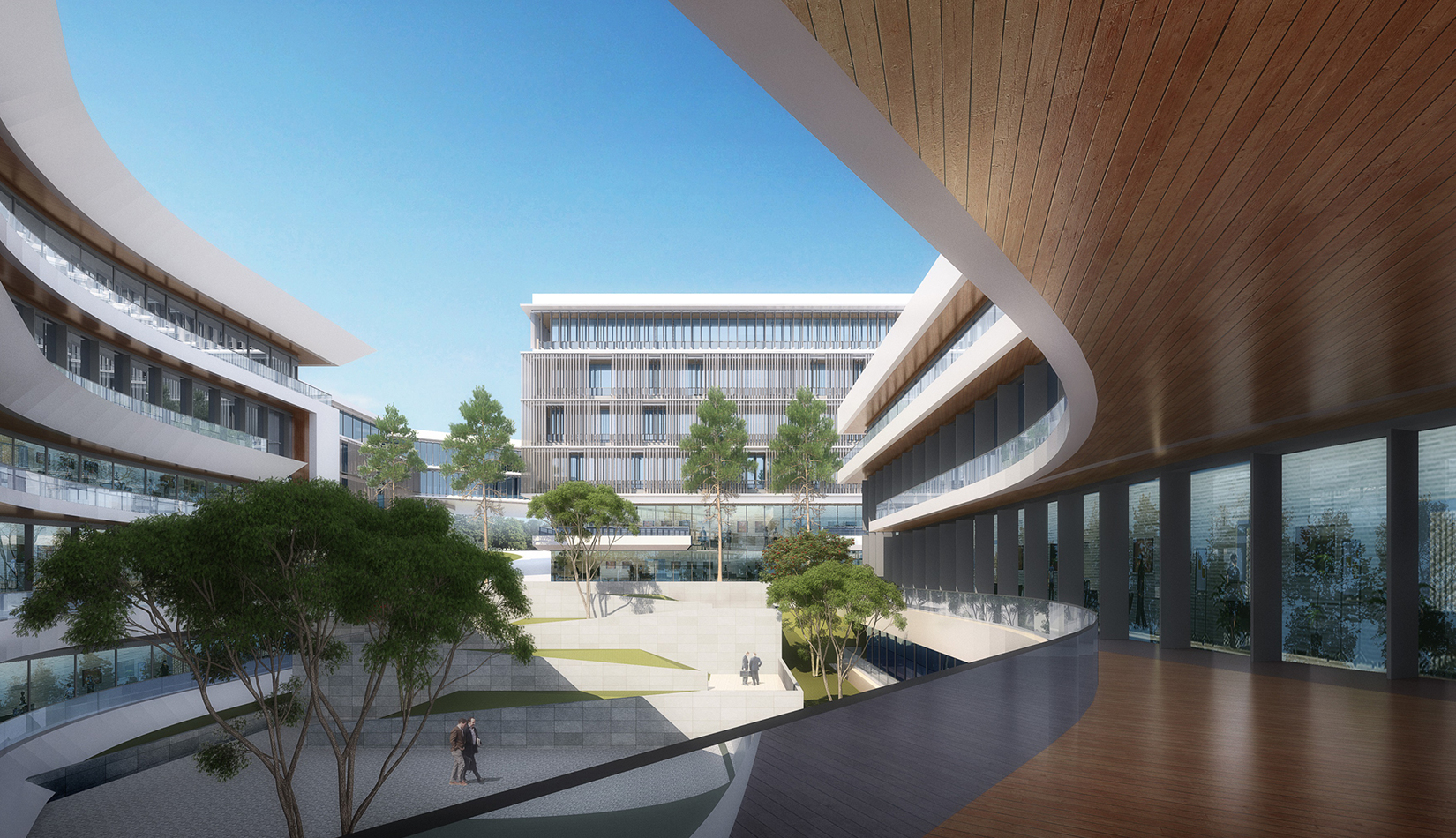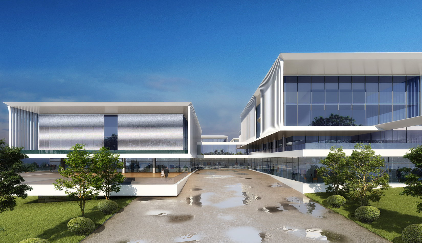 簡潔大氣的豎向橫向劃分,使MECS主樓充滿海洋氣息;白色流線型屋頂順應地勢,自由舒展。流線型的體塊靠近海岸線,表達科研人員的探索精神,并且與地勢相結(jié)合。