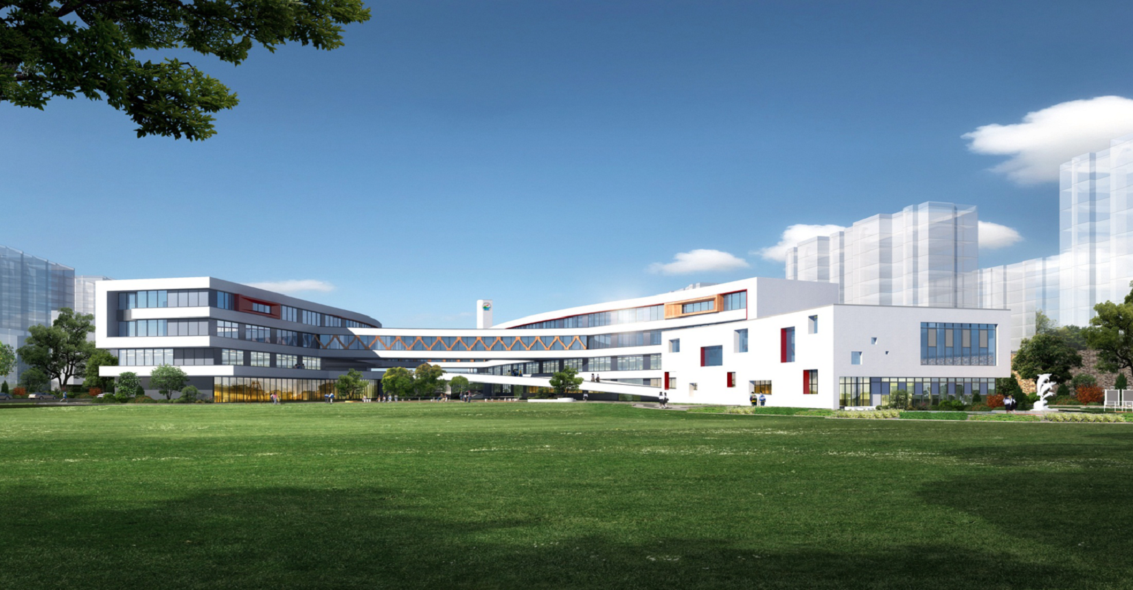 校園規(guī)劃采用曲線手法,營造流水姿態(tài),將東側山脈與西側河流連接在一起。設計現代化“山水”校園,使學生在自然中成長。營造活水發(fā)源的“源頭”意境,寓意教育為人類文化長河的源頭,呼應學?!霸搭^”文化。曲線舒展的形體,整體采用白色色調,局部以紅黃色進行點綴,風格純潔又不失活潑。